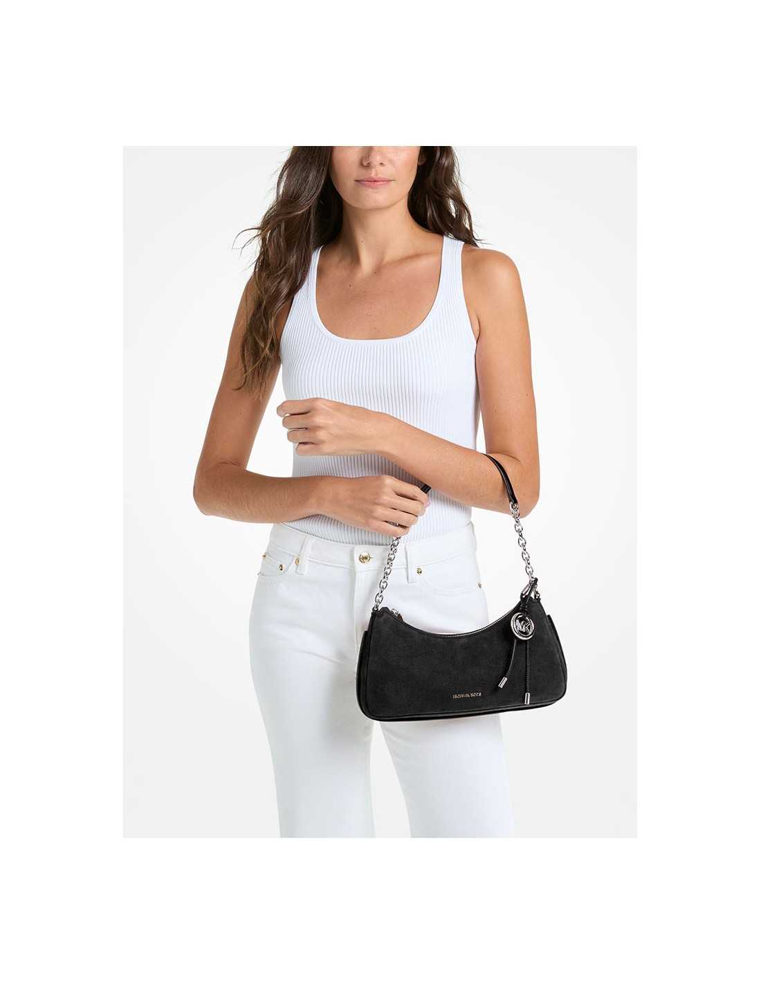 Borsa a spalla Michael Kors della linea Nolita realizzata in morbida pelle nabuk di colore nero. Il modello è caratterizzato da una silhouette "hobo" leggermente curvata con chiusura superiore a zip, un manico singolo che mixa pelle e catena argentata, e il classico charm con logo MK circolare.