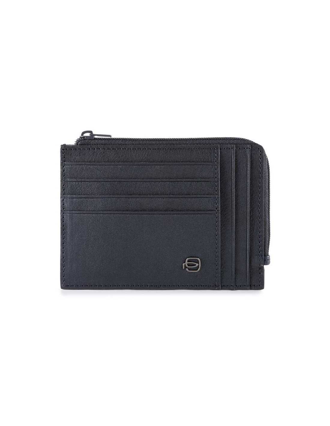 Bustina porta carte Piquadro in pelle con 8 slot per carte di credito e portamonete con zip.
